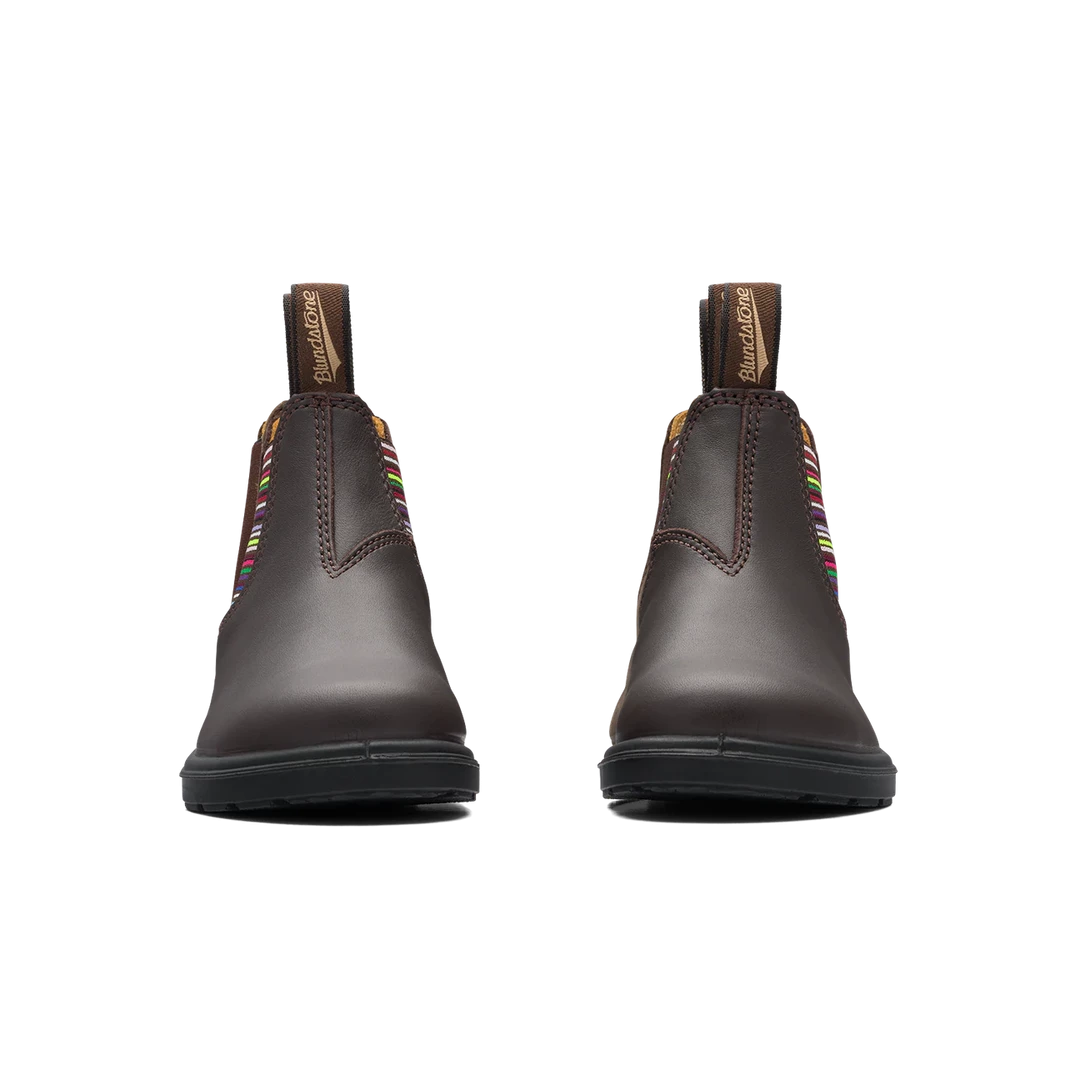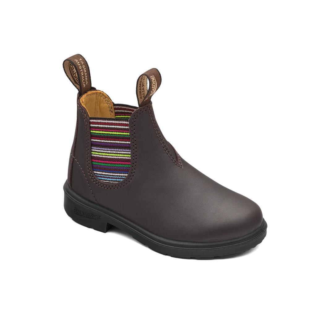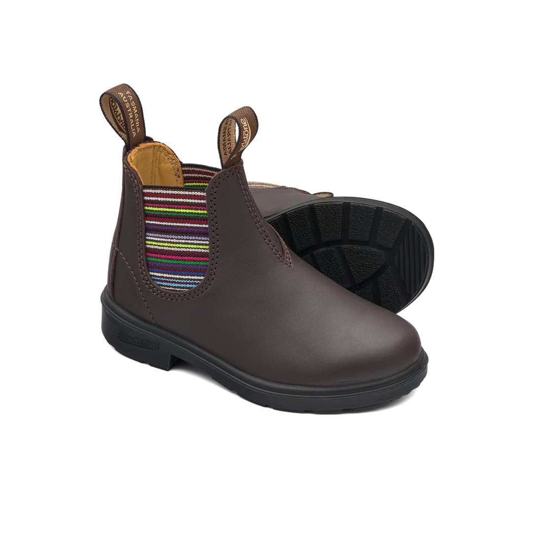 Blundstone 1413 Kids Chelsea in Brown with Striped Elastic is colourful fun and Blundstone comfort for little feet. No-lace freedom gives kids footwear independence. Moms, dads, and teachers, too. Removable insoles for months more wear.