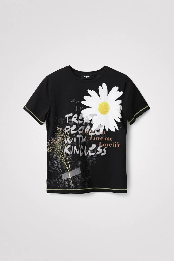 “Treat people with kindness” is the important message conveyed by this floral T-shirt. Featuring overlock backstitching in yellow on the sleeves and hem. Made from sustainable cotton.