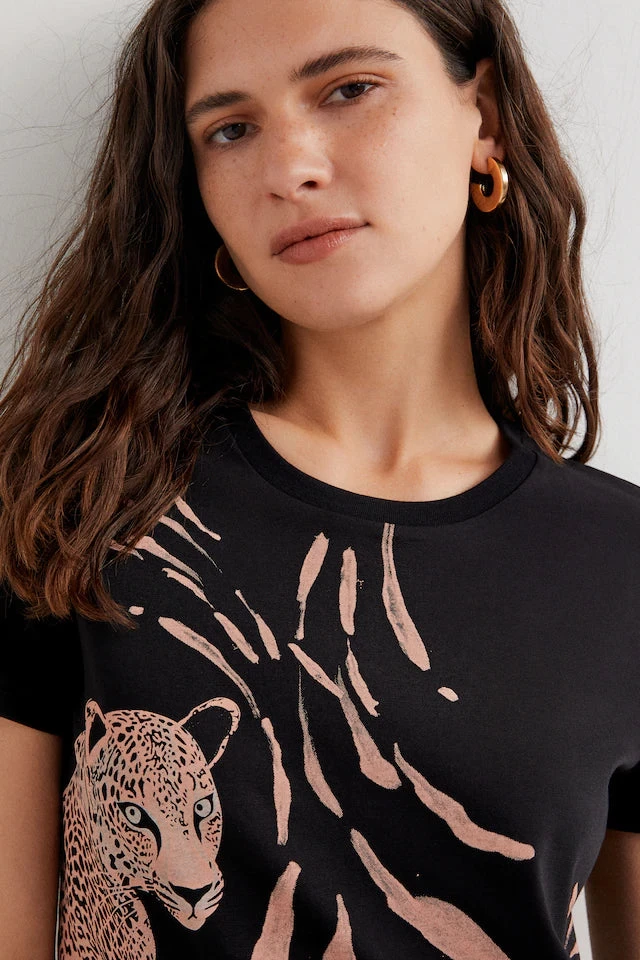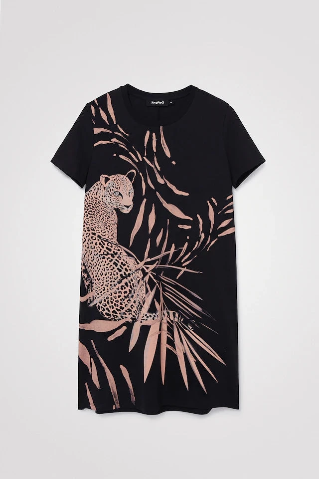 Let your wild side out with the comfy short sleeve Guepardita Dress! Made from 100% cotton, this tunic features a mini skirt, rounded neck line, and a fun cheetah print.