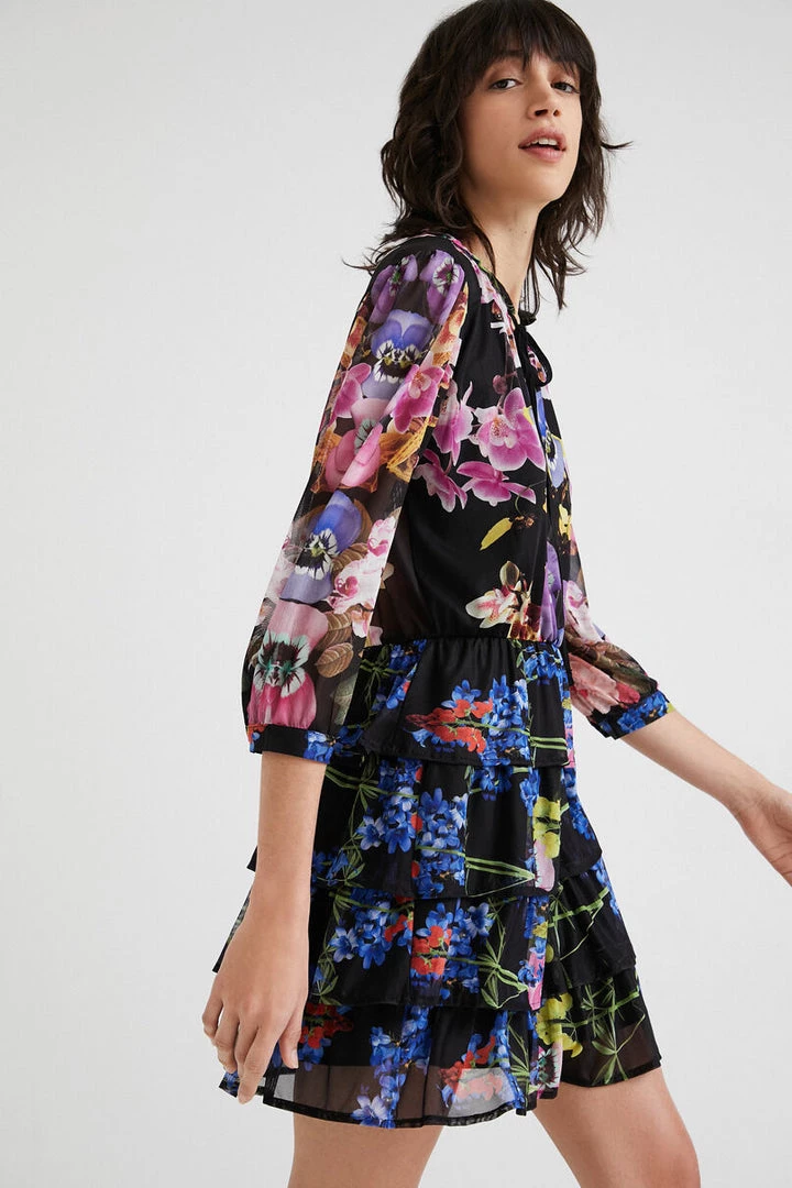 Eco-friendly viscose tulle and knit dress with an orchid print by M. Christian Lacroix. The sleeves are long and semi-transparent, and it features a layered skirt and a Mandarin collar with a cord.
