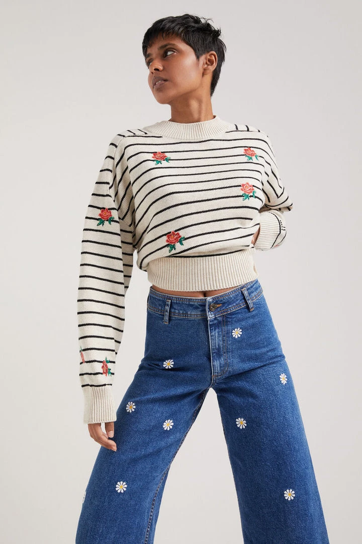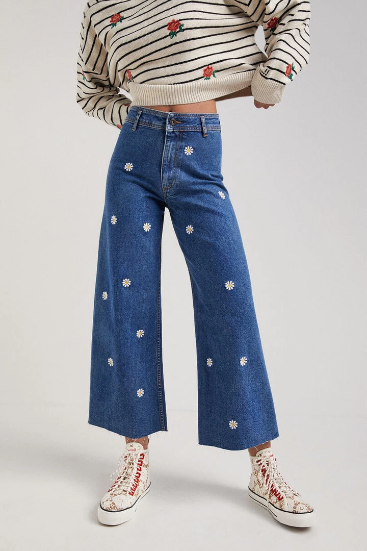 These denim culottes covered in embroidered white daisies are gently elasticated so they fit you like a glove. High-waisted with raw-cut hems and made from sustainable cotton.