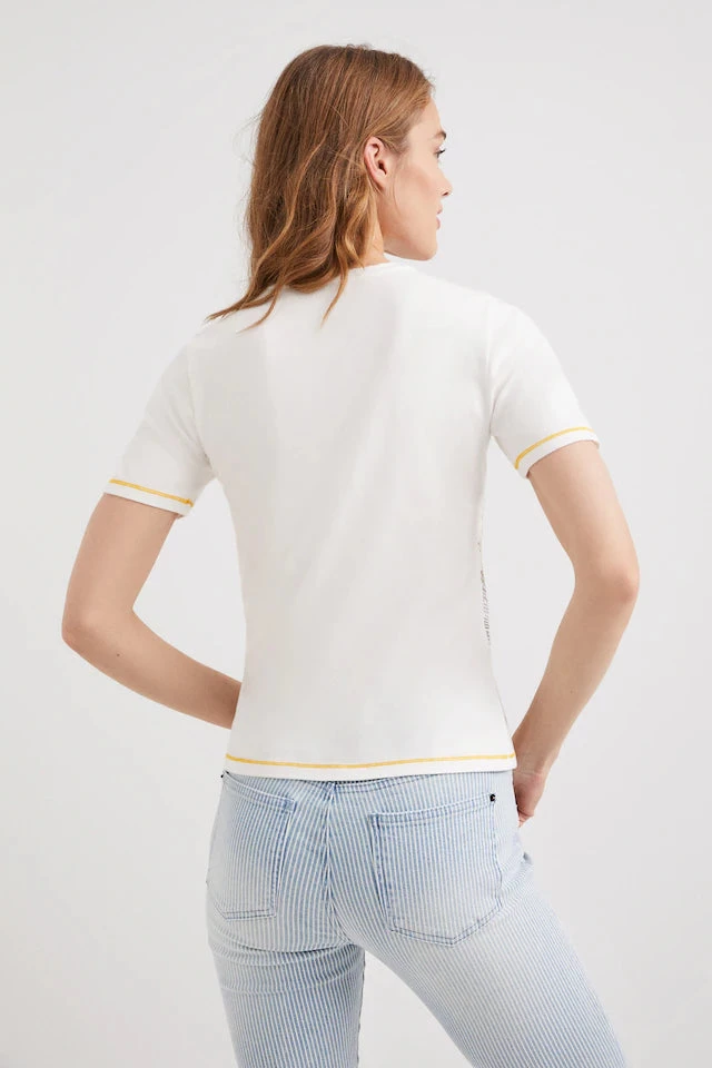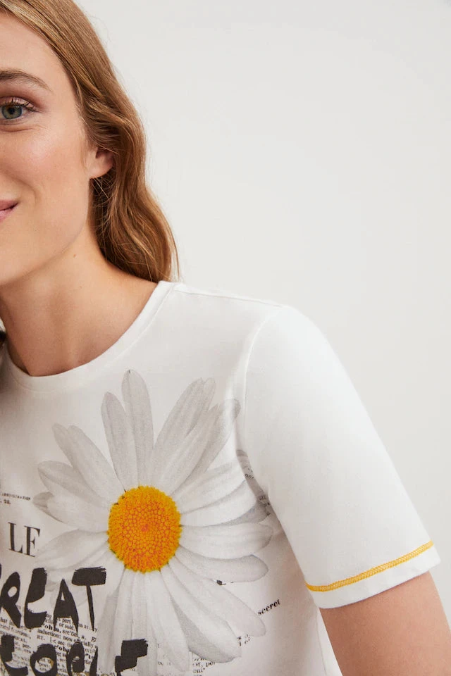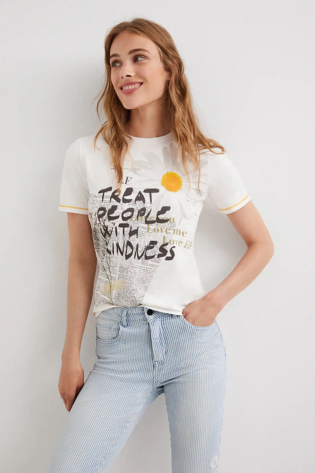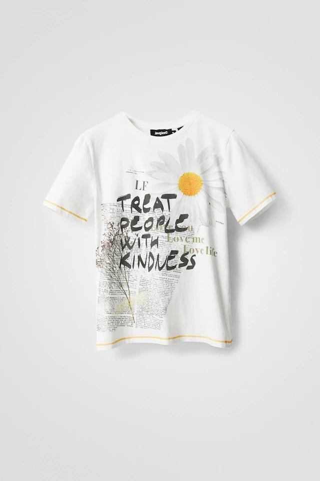 “Treat people with kindness” is the important message conveyed by this floral T-shirt. Featuring overlock backstitching in yellow on the sleeves and hem. Made from sustainable cotton.