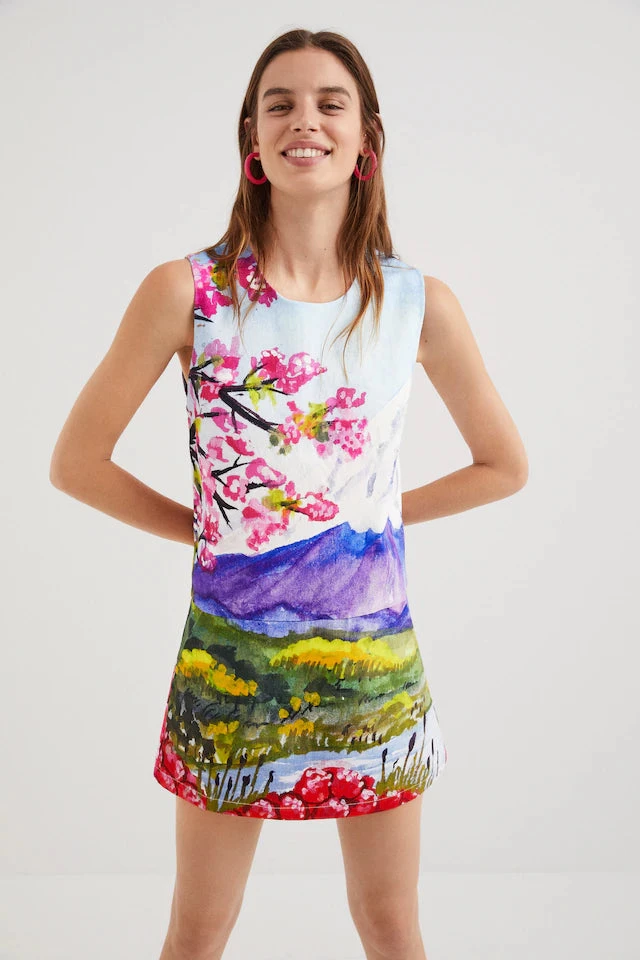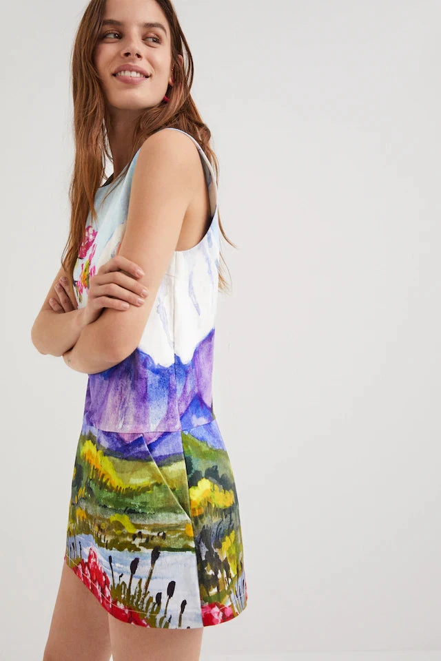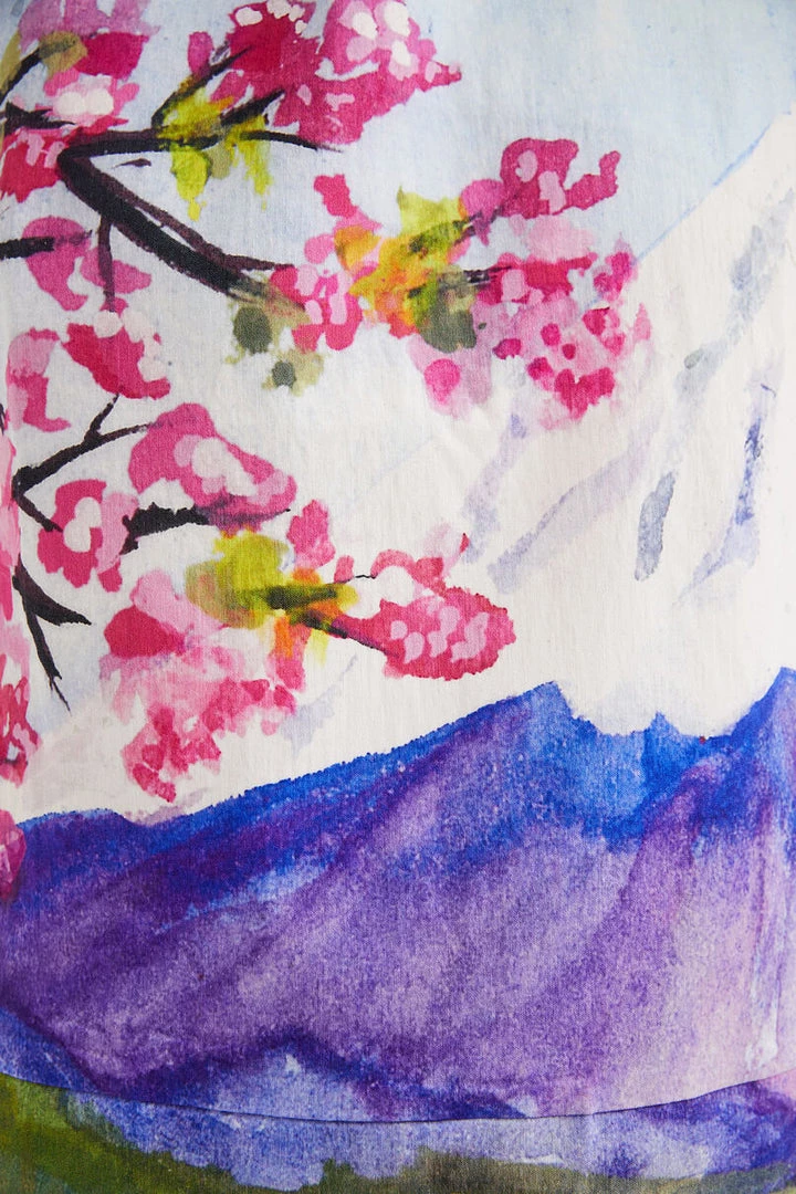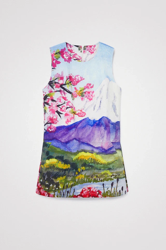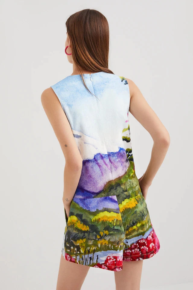 It seems like a mini-skirt dress, but a pair of super comfortable shorts are hidden underneath. This pinafore jumpsuit features a Japanese Mount Fuji landscape print. Made from eco-friendly viscose.