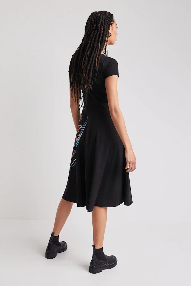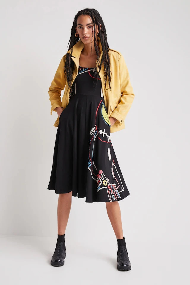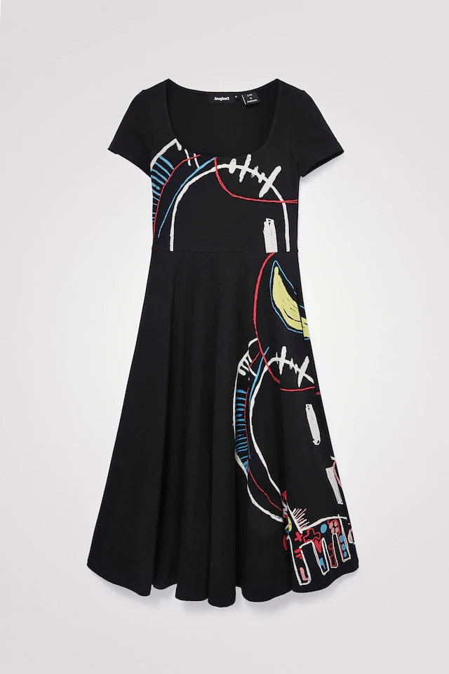 Ger spring-ready with the ultra-comfy Roma Dress! Made from black knit fabric with an arty print, this midi dress features an A-line cut, short sleeves, a square neckline and an elasticated finish in sustainable cotton.