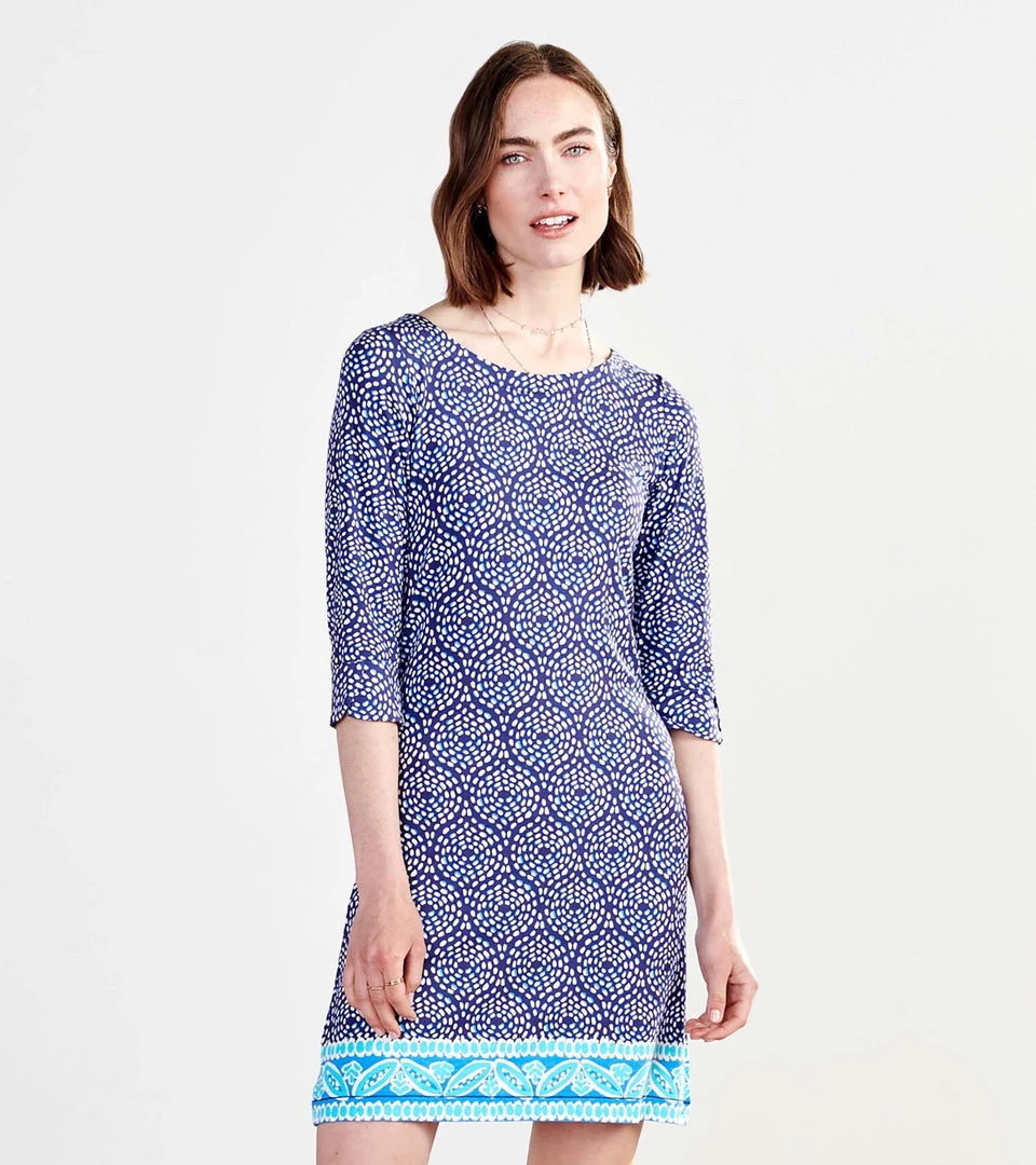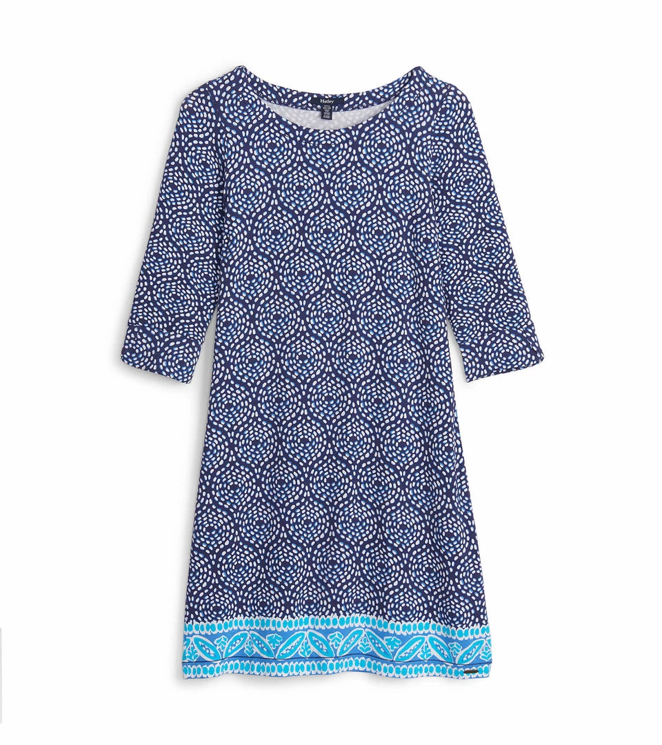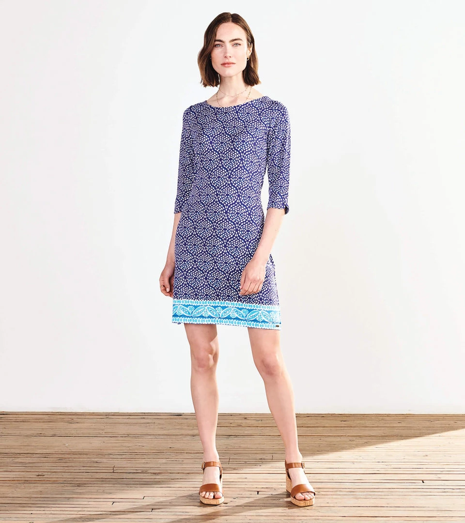 Looking for a simple semi-fitted dress that’s both comfortable and elegant? Try our stretchy-and-stylish Lucy dress. Crafted from a supersoft viscose blend, its lovely print features a contrasting border. 3/4 length sleeves neatly finished with peplum cuffs complete this elegant yet thoroughly modern dress.