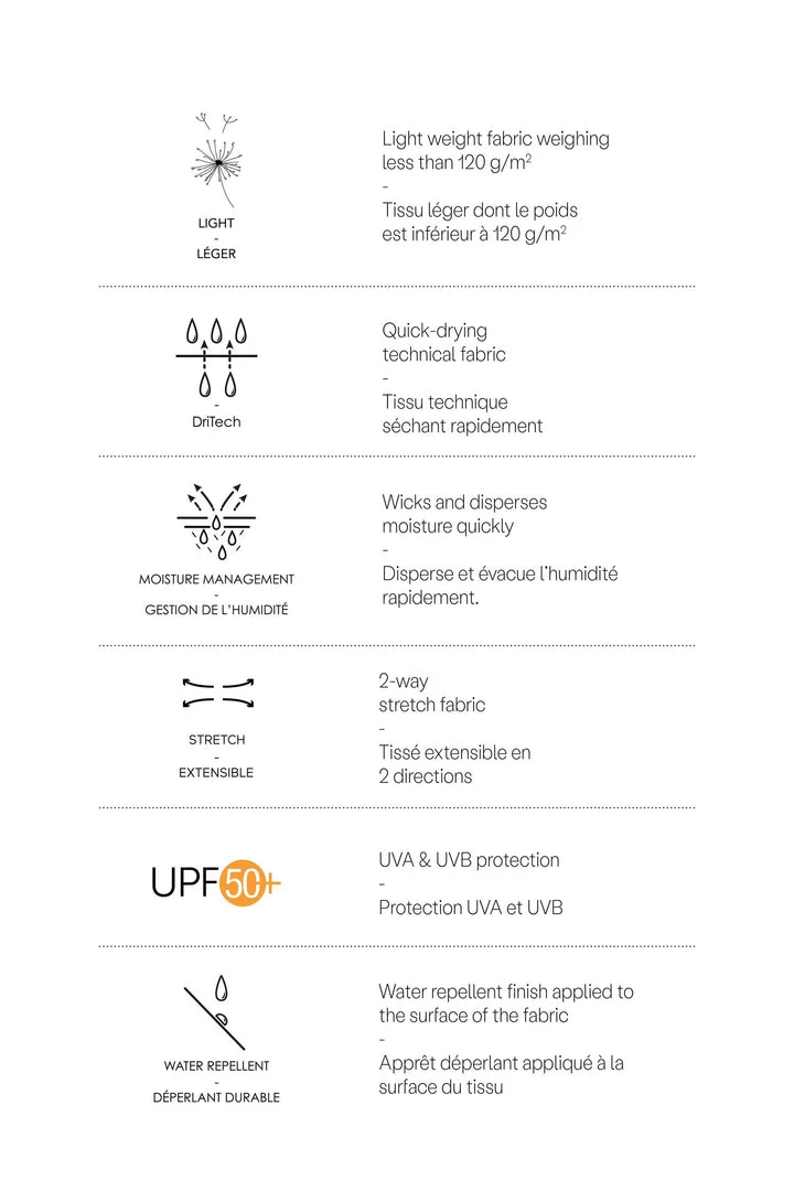 Fabric : 94% Nylon, 6% Spandex, 105g/m2, wicking finish