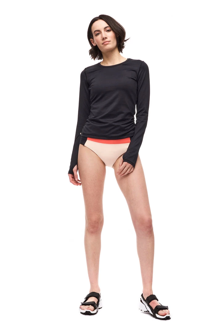 The RYNNA rash guard is made of a very soft fabric that offers high performance to support you in your activities, from trail to river. It offers high power stretch with excellent recovery and has a strong resistance to pilling. In addition to keeping you comfortable in the water, the RYNNA rash guard can be adjusted on the sides with sliders for a look that suits you best. The fabric has a high resistance to chlorine, sunscreens and oils.Â