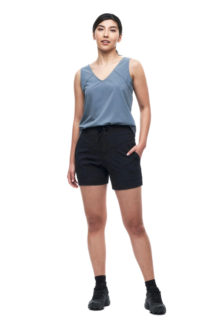 The HALKA ll sleeveless shirt is made of light woven fabric that offers comfort, lightness, softness and stretchability. The fabric dries quickly, has moisture wicking properties and has a UPF rating 30+. These features make this top versatile, great for travel and various outdoor activities.