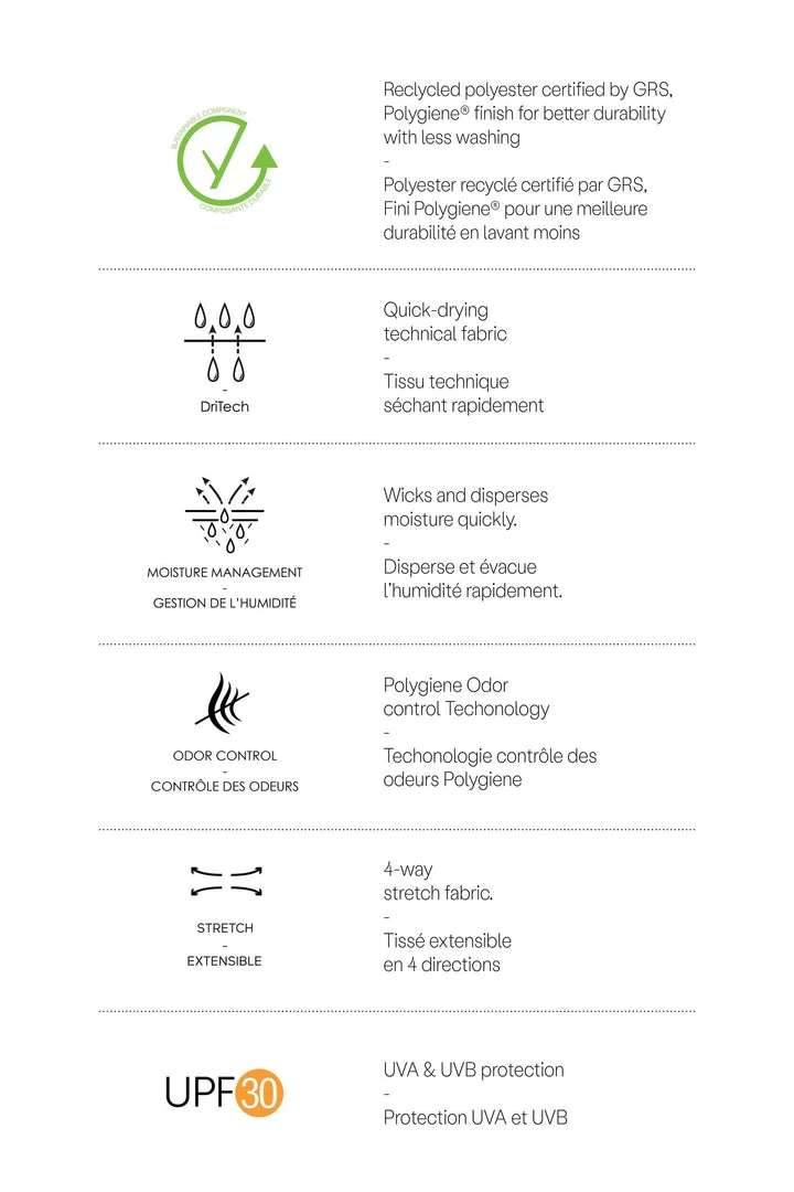 Fabric : 93% Recycled Polyester, 7% Spandex, 165g/m2 , Polygiene® Finish, GRS Approved