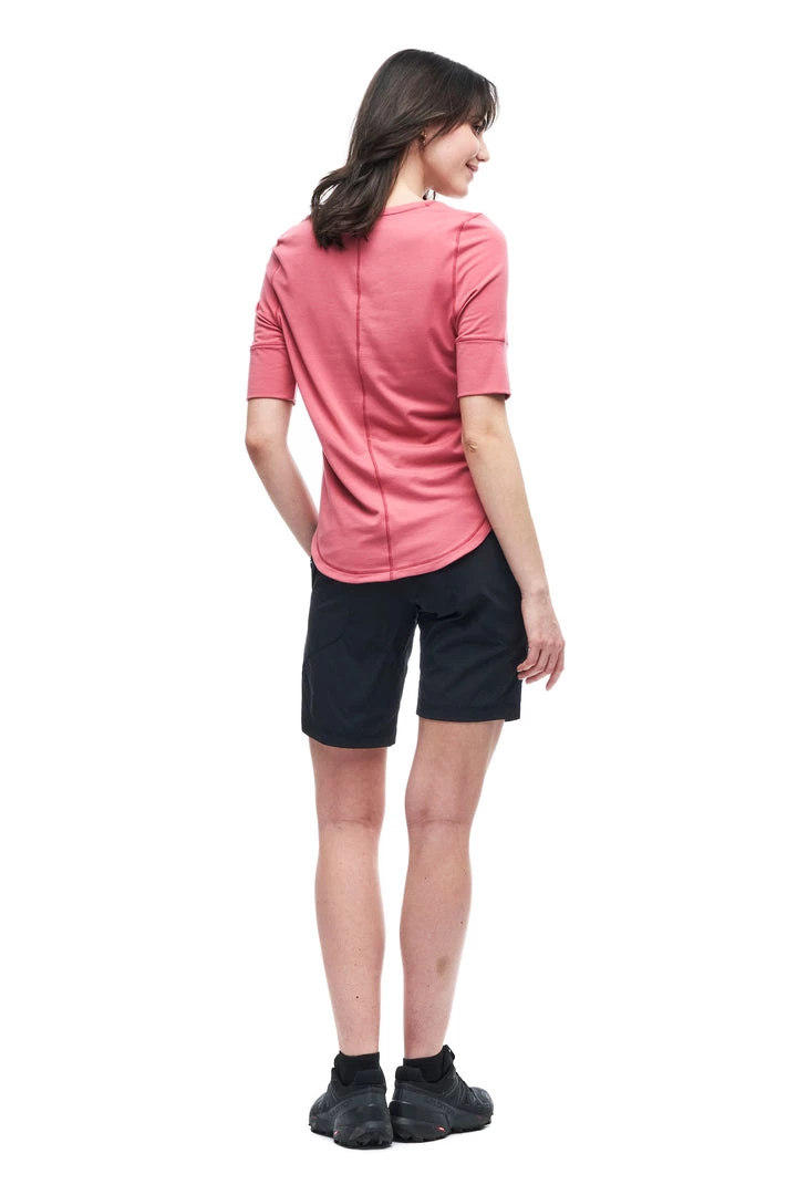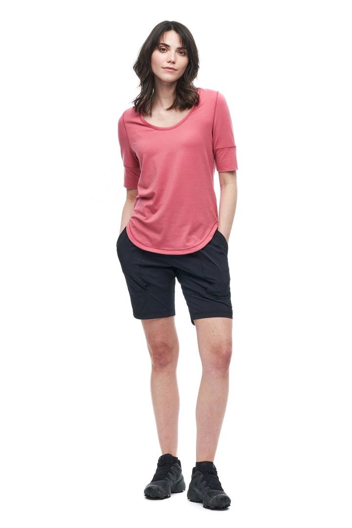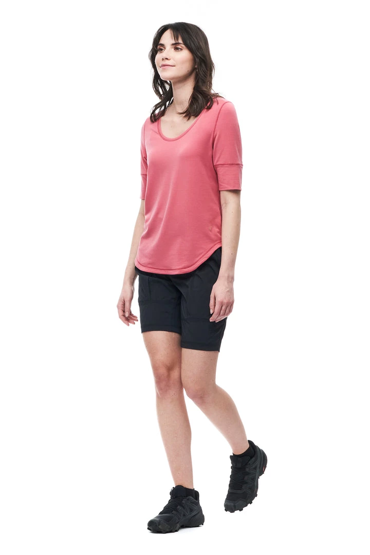 The VOOLAMA II top is made from fabric containing Lyocell, a cellulosic fiber made of wood pulp obtained from sustainable forests. Partially eco-friendly, drirelease® Lyocell ensures long-term fabric performance and maintains its softness after wash. It has moisture-wicking and fast drying properties, which minimizes odours and maximizes comfort and has a UPF rating 30+. The elbow-length sleeves and the scalloped hem on the sides give an all-round style for all your sports activities. These features make this top versatile, great for travel and various outdoor activities.