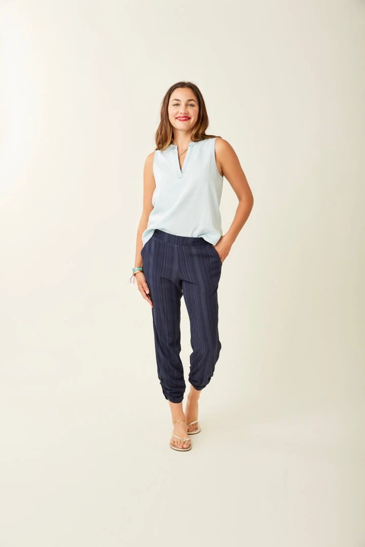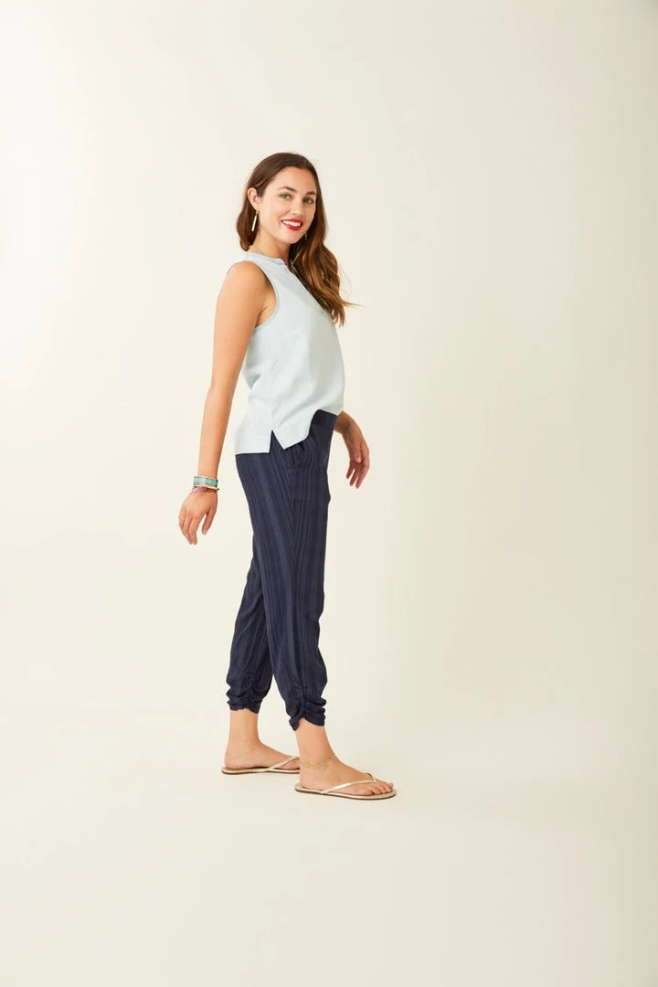 A classic beach pant to wear over a bathing suit or around a bonfire. These pants are made of a silky material and are also designed to be dressed up with a nice top and sandals. Ruched leg opening at bottom are a cute and flattering detail.