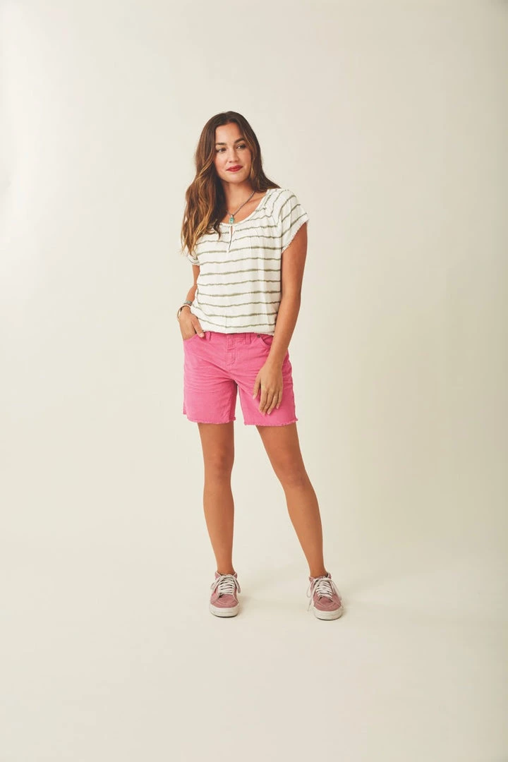 With delightful design details like a keyhole neckline and a smocked hem, the Lily is a charming chameleon that can be worn with slacks or denim cutoffs.
